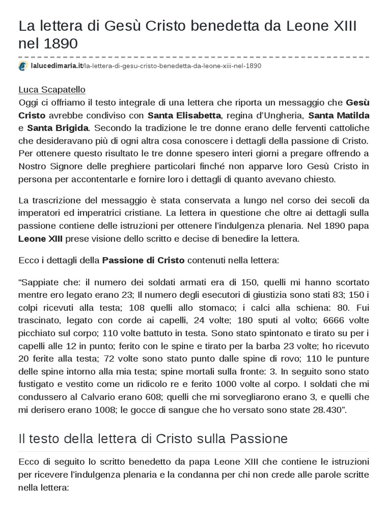 Domenica 23 aprile 2023, III Settimana Tempo di Pasqua Gloria. Gloria a Dio nell'alto dei cieli e pace in terra agli uomini, amati dal Signore. Noi ti lodiamo, ti benediciamo, ti adoriamo, ti glorifichiamo, ti rendiamo grazie per la tua gloria immensa, Signore Dio, Re del cielo, Dio Padre onnipotente. Signore, figlio unigenito, Gesù Cristo, Signore Dio, Agnello di Dio, Figlio del Padre, tu che ... MESSAGGIO DI GESÙ. LETTERA TROVATA NEL SANTO SEPOLCRO DI ... MESSAGGIO DI GESÙ. LETTERA TROVATA NEL SANTO SEPOLCRO DI NOSTRO SIGNORE GESU’ CRISTO IN GERUSALEMME. Fu conservata in una scatola d’argento da sua Santita’ e dagli Imperatori ed Imperatrici della Fede Cristiana. Santa Elisabetta, regina di Ungheria, Santa Matilde e Santa Brigida, volendo sapere alcune cose sulla Passione di Gesu ...